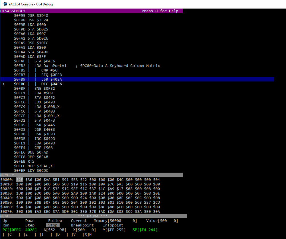 The disassembly shows the memory content as CPU instructions. You can navigate with the cursor keys as follows: